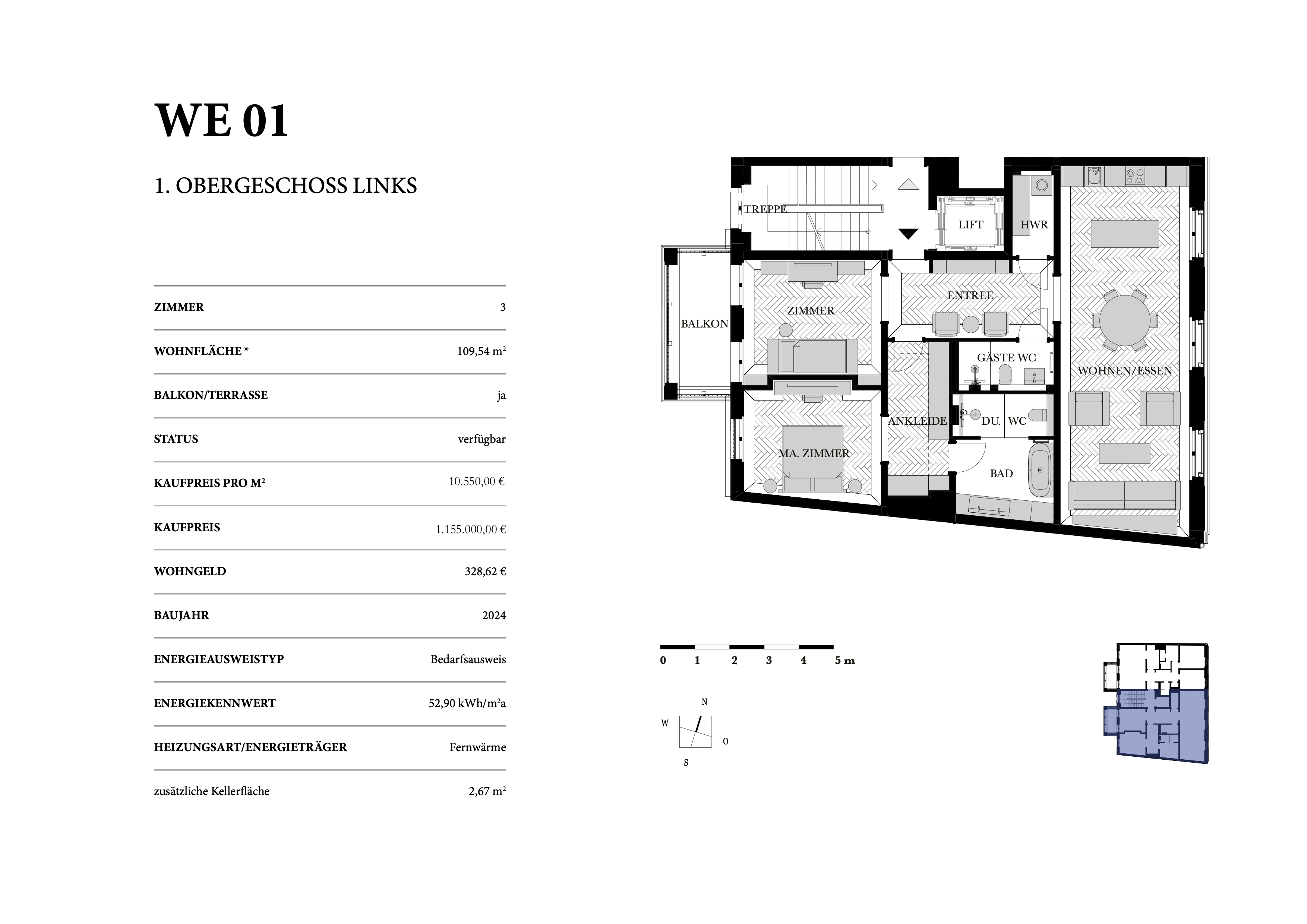 Die Konzeption der 9 bezugsfertigen Wohnungen nimmt Referenzen zur Wohnqualität klassischer Altbau-Wohnungen auf. Einzigartig ist die Gestaltung des Vestibüls durch massive Naturstein-und Terrazzofliesen sowie elegante Stuckdecken.